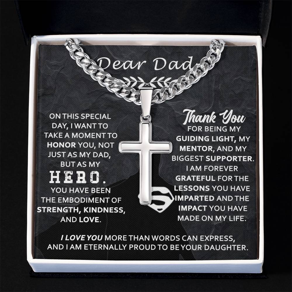 Honor your father with this Cross Pendant Necklace Gift for Dad, a powerful symbol of faith, strength, and love. Presented in an elegant box with a heartfelt message, it celebrates him not only as a dad but as a true hero, your guiding light, mentor, and unwavering supporter. The card’s touching words express gratitude for his lessons, kindness, and the lasting impact he’s made on your life. Perfect for Father’s Day, birthdays, or any special occasion, this gift will remind him daily of your deep love and pride.